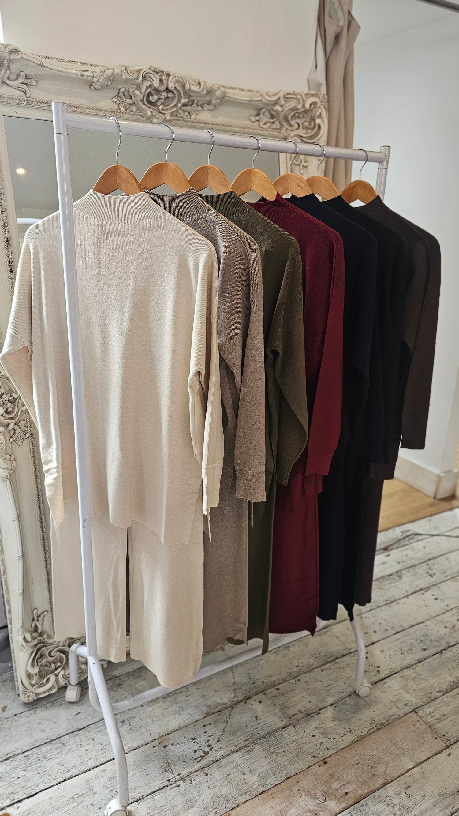 This comfortable and stylish Nikki two-piece set features a high neck design and an elasticated waist for a perfect fit. The wide leg pants also feature a side split for added elegance and freedom of movement. Elevate your wardrobe with this versatile and chic ensemble.