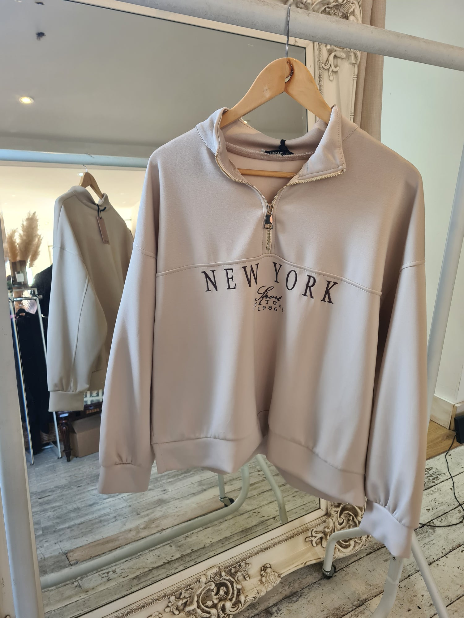 NEW YORK EMBROIDERY ZIP UP SWEATSHIRT IN BEIGE